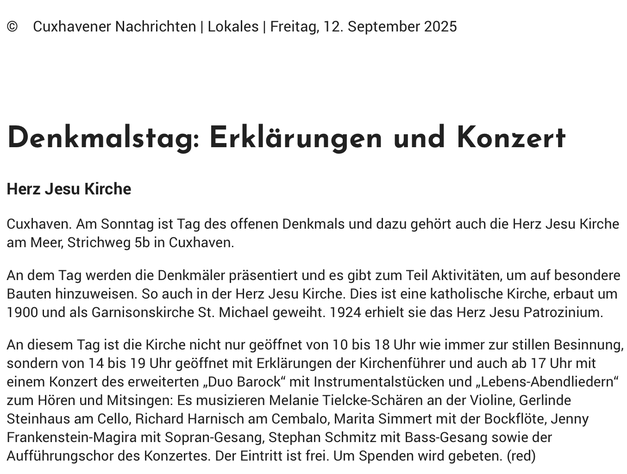Mehr als zwanzig Besucher kamen am Tag des offenen Denkmals in die Herz-Jesu-Kirche am Meer, Urlauber, Einheimische aus Cuxhaven und sogar aus dem Umland. Aufmerksam geworden waren sie durch die Plakate, den Artikel in der Tageszeitung und die ausführlichen Ankündigungen in den Gottesdiensten. Am meisten beeindruckten die Geschichte und das Gesamtbild der Kirche, der Tenebrae-Leuchter und der Fußboden mit seinen Fossilien. Mit dem Konzert des „Duo Barock“ zum Abschluss ein sehr gelungener Tag.